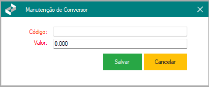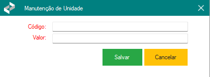 2 - No campo “Código” preencha o código do Material que será alterado e no campo “Valor” preencha a nova unidade de medida para associar ao material correspondente. Para concluir o cadastro, clique no botão “Salvar”.