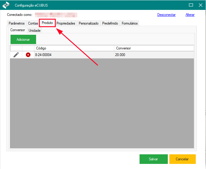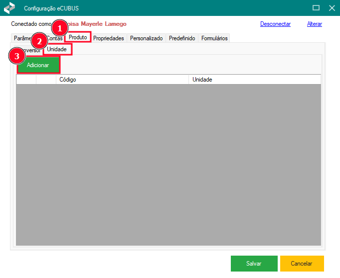 1 - Na tela de Configuração eCubus, acesse a aba “Produto” e depois a aba “Unidade” e então clique no botão “Adicionar”.