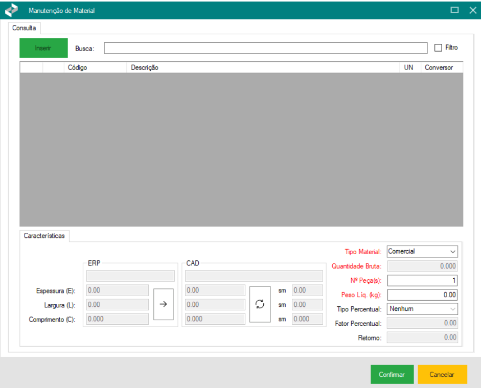 - Quantidade Bruta: valor calculado automaticamente, considerando as dimensões, sobremetal, tipo de material e conversor associado.