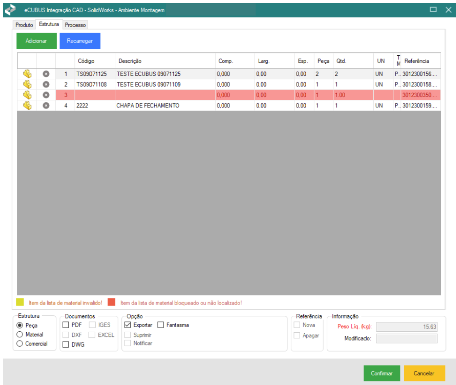 A aba Estrutura, localizada na janela Ambiente Montagem, é destinada à visualização e gerenciamento das peças e materiais que compõem a montagem.