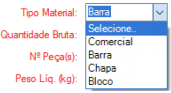 - Tipo Material: Define o tipo de material, o que influencia diretamente no cálculo da quantidade bruta.