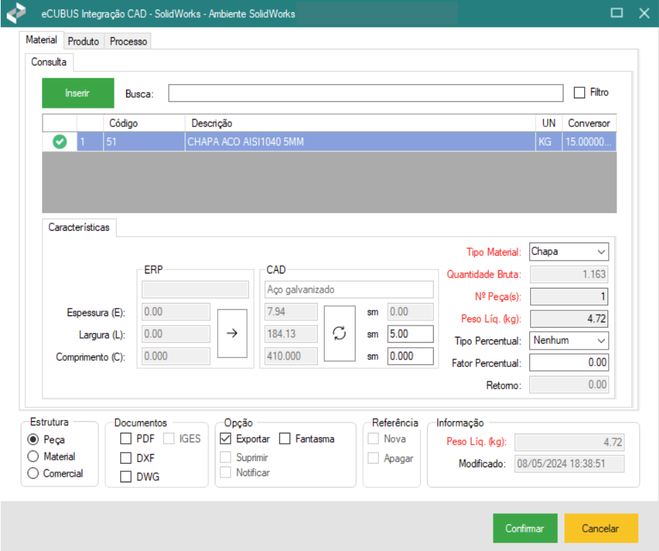 1) Para cadastrar um produto como Peça, é necessário que um arquivo de peça esteja aberto no CAD. Com a peça aberta, acesse o menu de comandos do Integrador eCUBUS e clique no botão “Executar”. 2) Após o carregamento, será exibida a aba Material. No ...