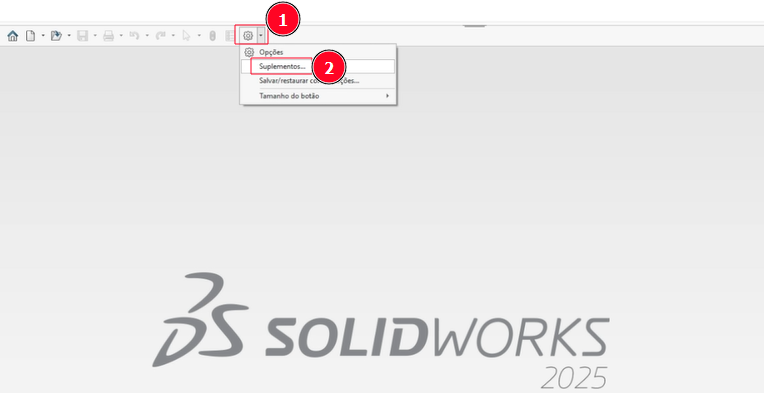 Para resolver essa situação, se faz necessário acessar as configurações do SolidWorks e ir em "Suplementos"