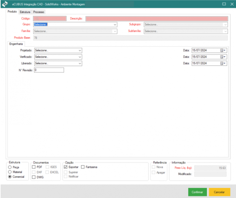 1) Para cadastrar uma montagem como Peça, é necessário que uma montagem esteja aberta no CAD. Se estiver, acesse o menu de comandos do Integrador eCUBUS e clique no botão “Executar”. 2) Ao concluir o carregamento, será apresentada a aba Produto. ...