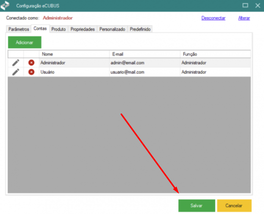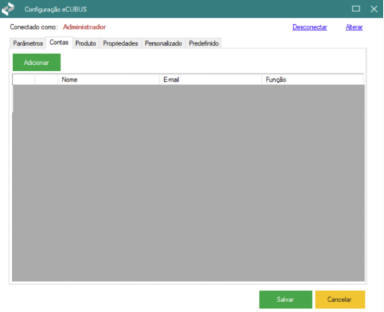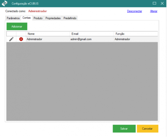 A aba "Contas" permite adicionar novos usuários ao sistema e definir o seu nível de acesso.