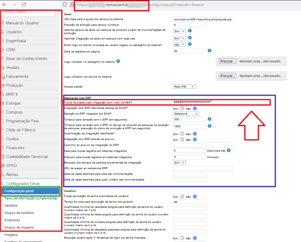 - Localize a seção “Integração com ERP” e copie o valor do parâmetro: “Chave de acesso para integração com o ERP via REST”.