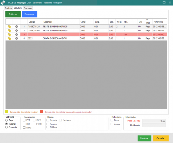 1) Para cadastrar uma montagem como Comercial, é necessário que uma montagem esteja aberta no CAD. Com a montagem aberta, acesse o menu de comandos do Integrador eCUBUS e clique no botão “Executar”. 2) Após o carregamento, a aba Produto será exibida. ...