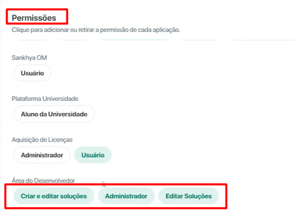 - Vá até a aba Permissões e localize a opção Área do Desenvolvedor.