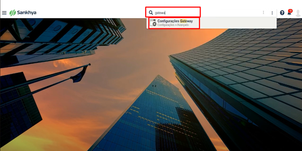 - No campo de pesquisa do sistema, digite Configurações Gateway e abra a tela correspondente