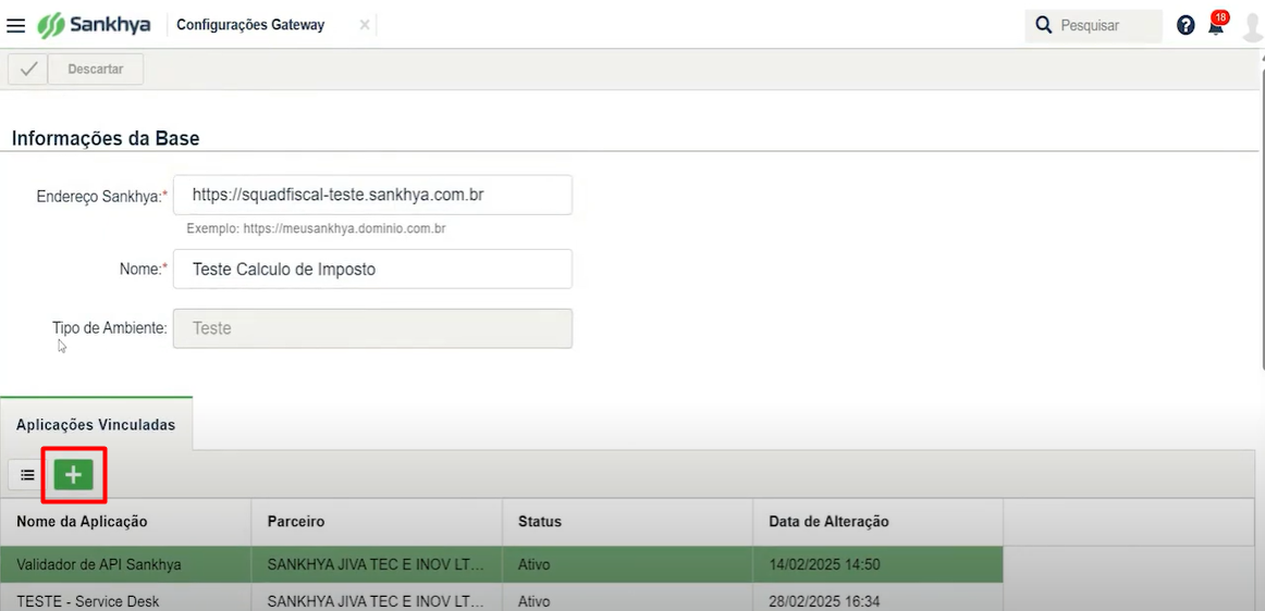 - Clique no botão “+” (Adicionar) para incluir uma nova aplicação de integração