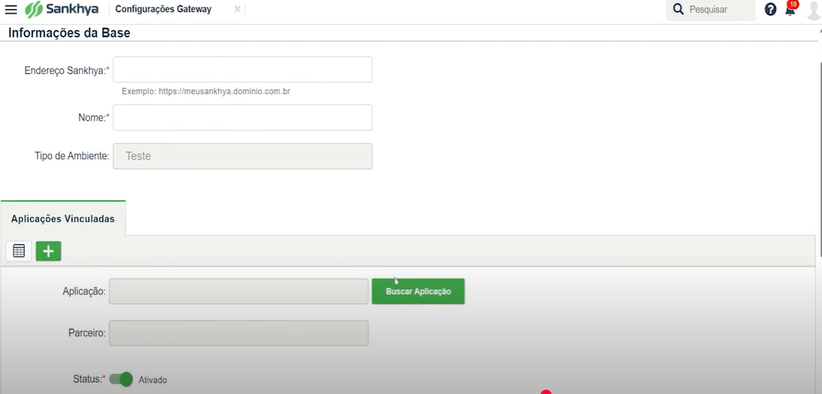 - Preencha as informações necessárias (nome da aplicação, parceiro, status, usuário de integração etc.).