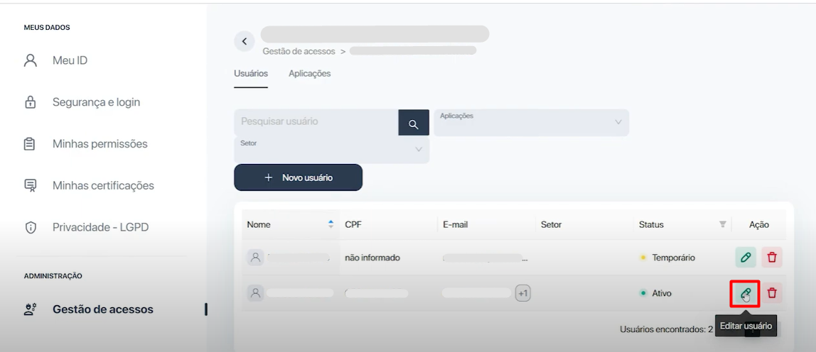 - Na aba Usuários, edite o usuário que deve receber a permissão.