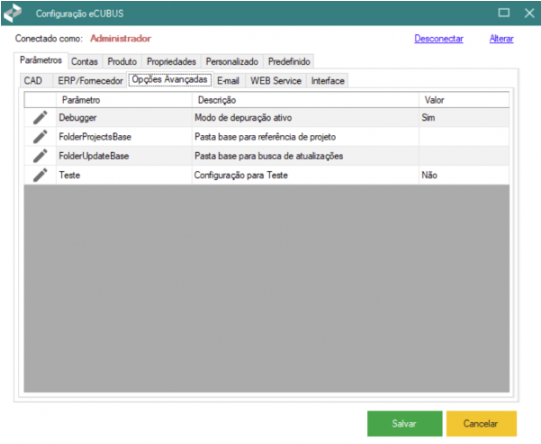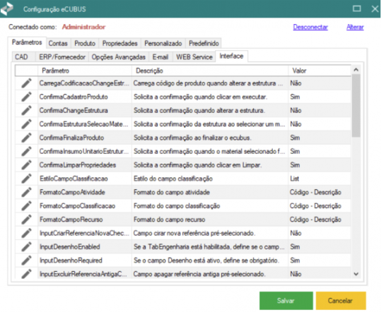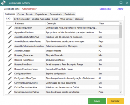 Na aba CAD, dentro da aba Parâmetros, é possível realizar a configuração e personalização de diversas funcionalidades referentes ao CAD correspondente. Alguns dos principais parâmetros são: