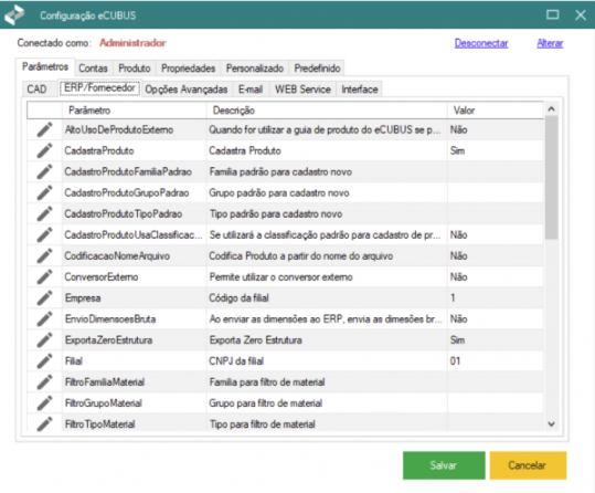 Na aba "Parâmetros" se encontram os menus que permitem configurar diversas opções e definições que controlam o comportamento e a funcionalidade do Integrador eCUBUS. Nela é possível ajustar configurações como bloqueios de exportação, salvamento automático, especificações de unidades de medida, entre outros. Além disso, a janela pode incluir opções para definir diretórios padrão para armazenamento de arquivos, parâmetros de validação e segurança, personalização de campos e configurações de e-mail e banco de dados.