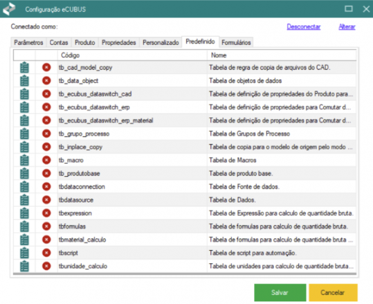 1 - Na janela de Configuração eCubus, acesse a aba “Predefinido” e clique no ícone de prancheta no campo correspondente a “tbprodutobase”