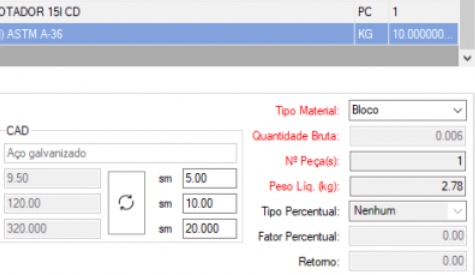 | Bloco | ( (Comprimento + Sobremetal) / 1000) * ( (Largura + Sobremetal) / 1000) * ( (Espessura + Sobremetal) / 1000) * Conversor |  |