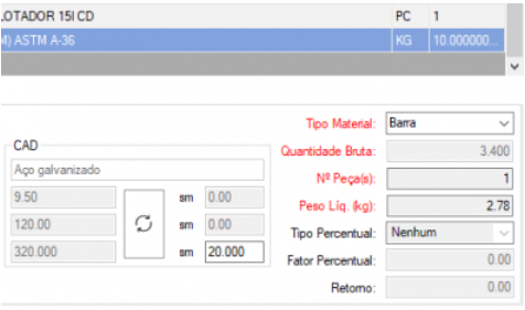 | Barra | ( (Comprimento + Sobremetal) / 1000) * Conversor |  |