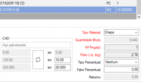 | Chapa | ( (Comprimento + Sobremetal) / 1000) * ( (Largura + Sobremetal) / 1000) * Conversor |  |