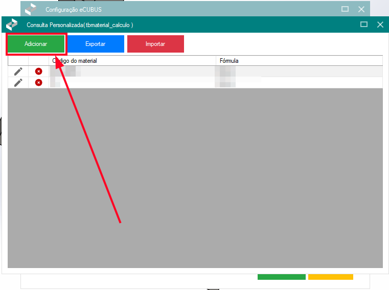 Na tela da tbmaterial_calculo, além do botão Adicionar, você encontrará também os botões Exportar e Importar: